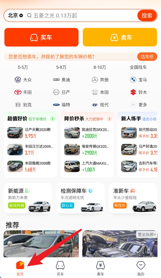 1、首页界面提供买车、卖车入口,支持按价格区间及品牌快速浏览,选择更省心。