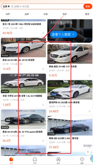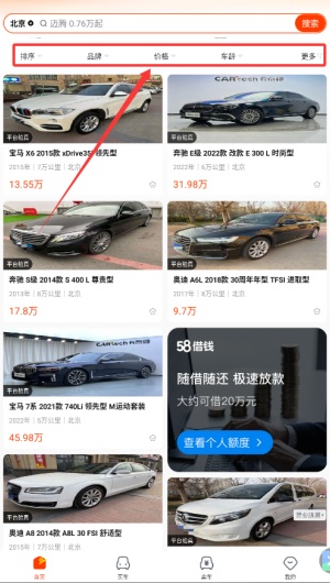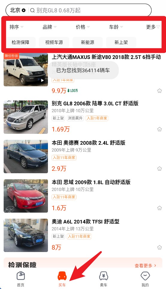 2、点击“买车”后可筛选品牌、价格、车龄等条件,快速锁定心仪二手车。