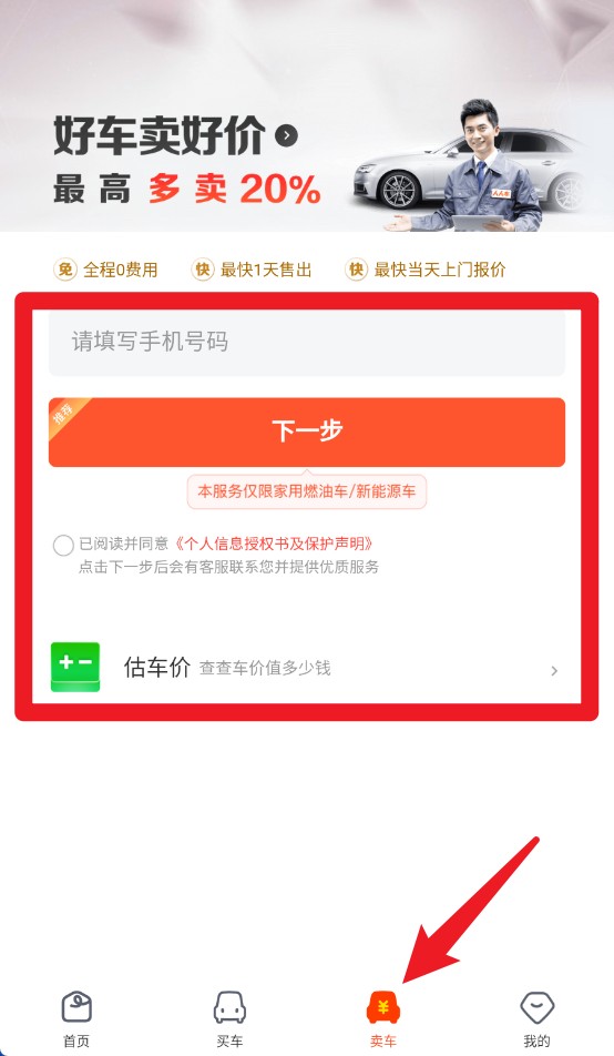 3、进入“卖车”页面填写手机号即可估价,流程简洁,最快当天可上门服务。