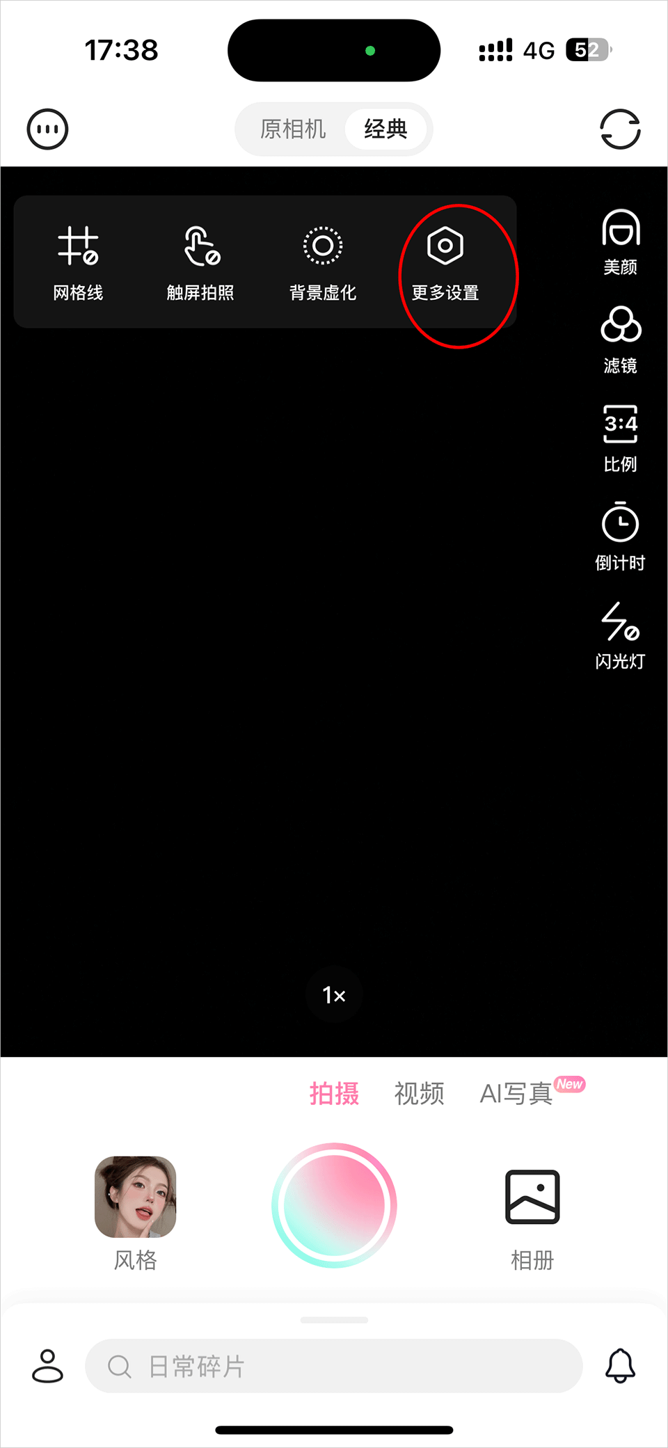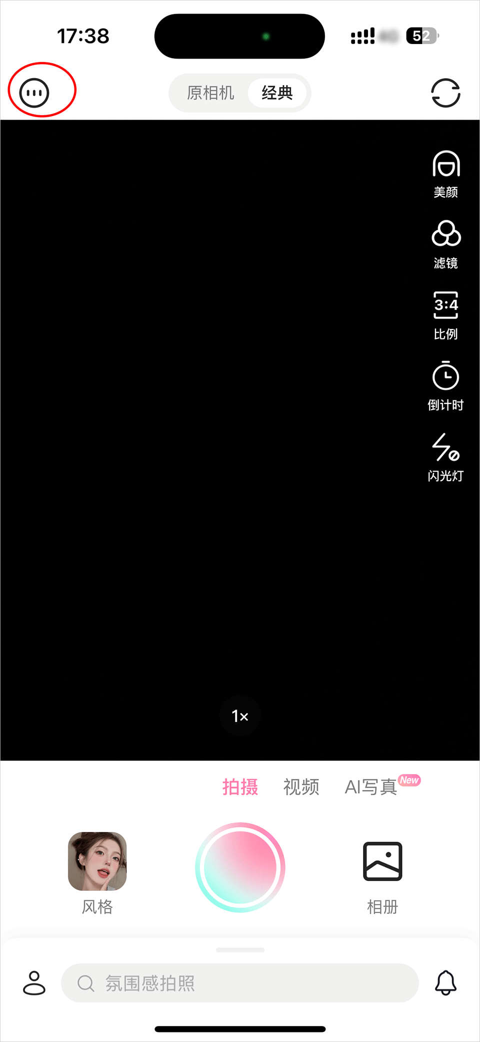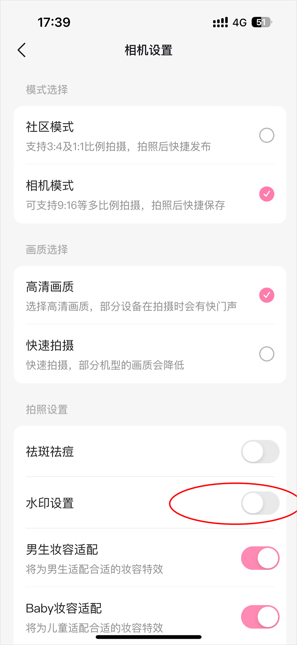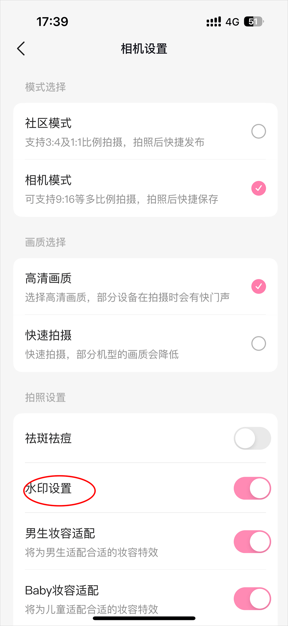 4、关闭水印设置后的小圆圈后,拍摄照片时就不会有轻颜水印