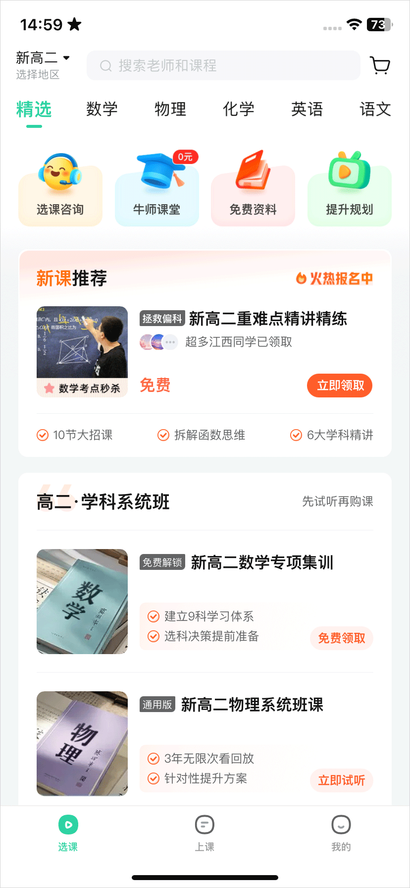 好课在线APP涵盖了高中数学、物理、化学、语文、历史、生物、政治等多个学科的课程,更有多元学习资料、视频内容、学情分析工具等多方位满足高中学生及家长用户的学习需求。