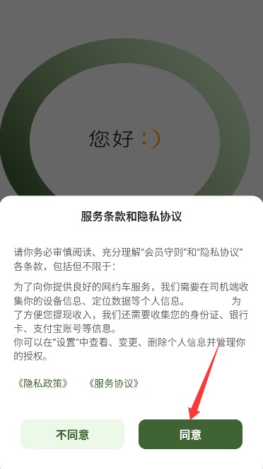1、打开应用后仔细阅读服务协议和隐私政策,确认后点击同意按钮进入应用。