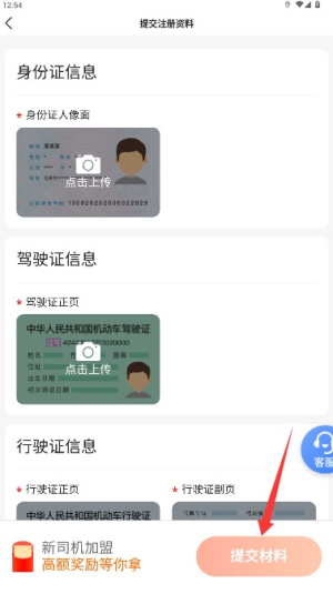 4、按要求上传身份证、驾驶证及车辆行驶证等资质文件,确认无误后提交注册申请。