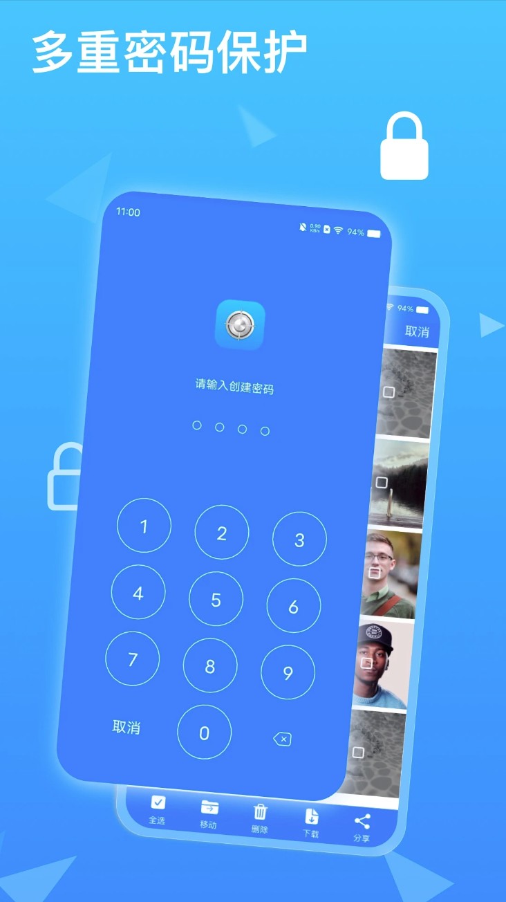 1. 提供多重密码锁机制,支持图案、指纹、数字密码自由组合。