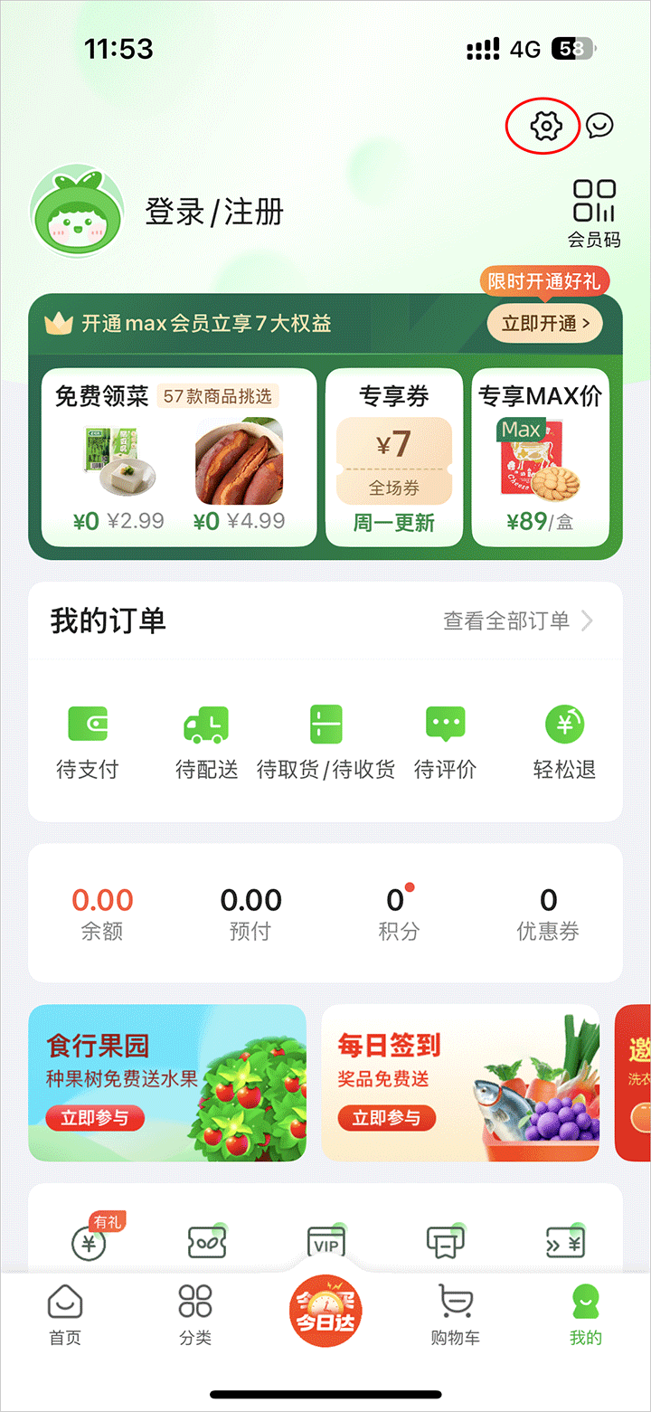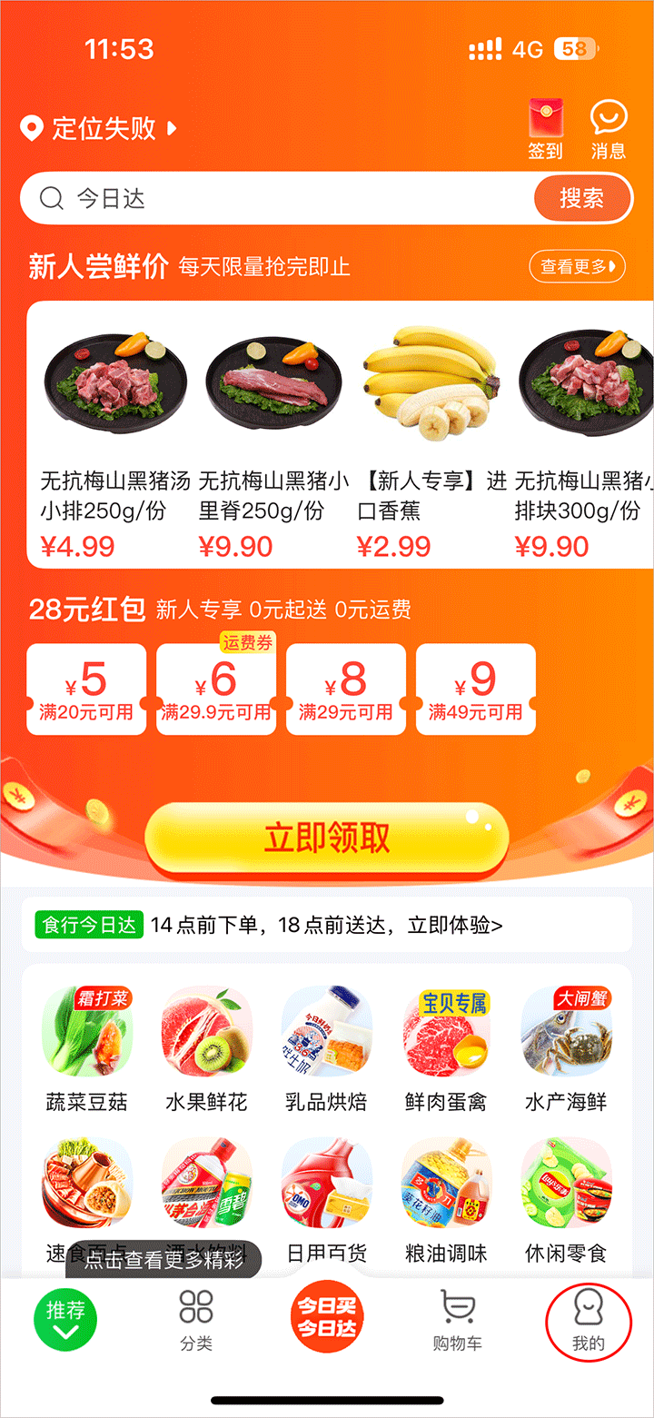 1、打开食行生鲜app最新版本进入首页点击右下角我的栏目
