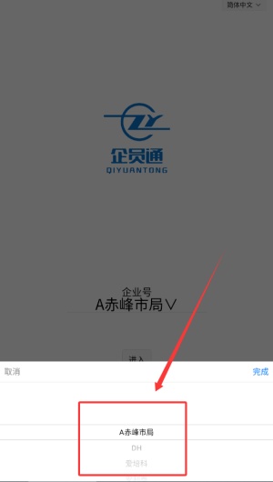 1、打开APP,在企业选择界面滑动查找并点击所属企业名称,确认无误后点击右上角“完成”进入下一步。