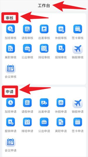 3、进入“工作台”后,在审批区可点击对应模块处理加班、请假、出差、休假等待审核事项,在申请区可发起相关业务申请。