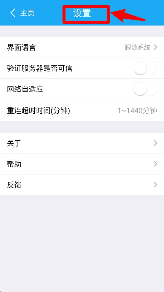 3、点击右上角齿轮图标进入“设置”页面,启用网络自适应与服务器验证。