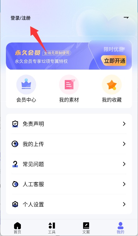 3、在个人中心页面上方找到“登录/注册”入口,点击进入账号验证界面。