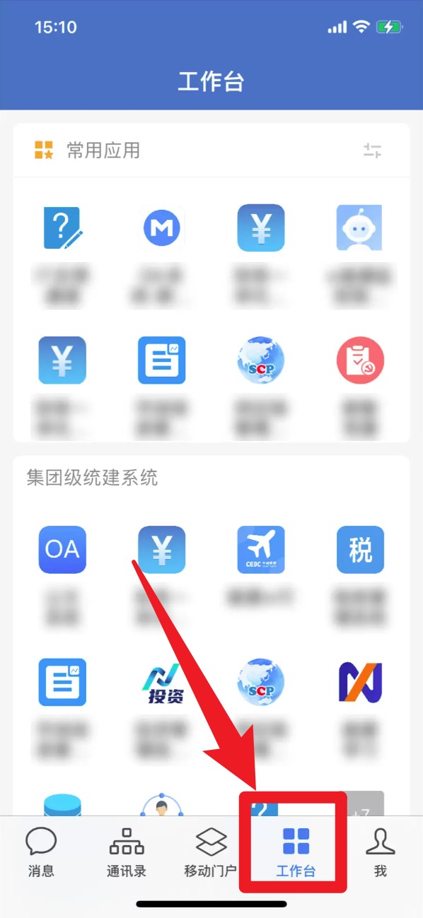4. 登录成功后进入「工作台」,可快速访问集团系统应用,统一入口一屏整合常用工具。