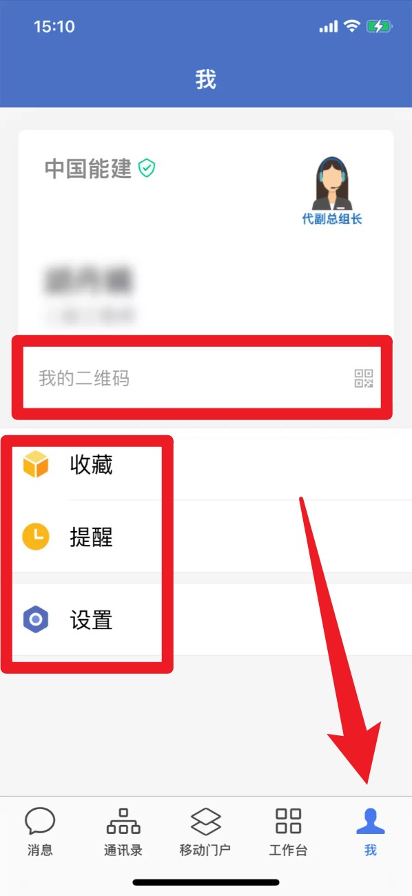 5. 在「我」页面可查看个人信息、二维码名片,还可设置提醒事项、收藏模块与系统设置。
