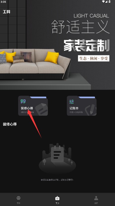 2、在工具功能区找到并点击"装修心得"板块,进入经验分享与内容浏览页面。