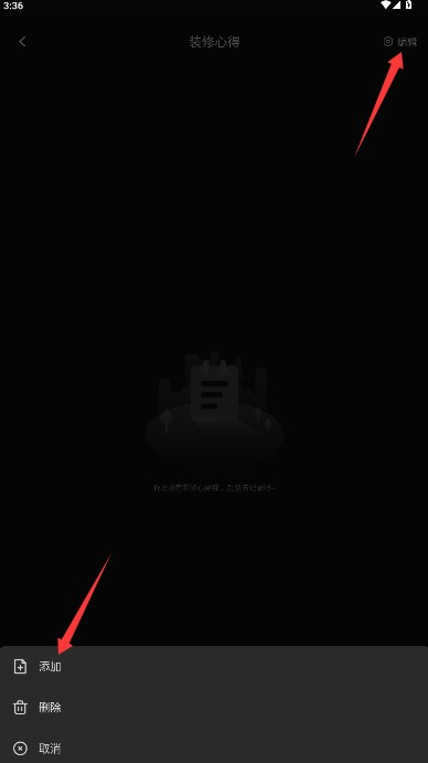 3、点击页面右上角的编辑功能按钮,选择添加选项进入心得创作编辑界面。