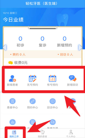 2、在我的工作界面,可以新增患者、处理无号或有号预约,还能快速登记新增回访,方便医生高效安排日常工作。