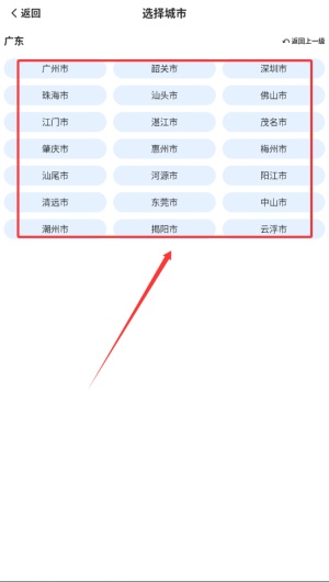 4、接着在市区列表中点选您当前居住或常用的城市区域,完成位置设定。