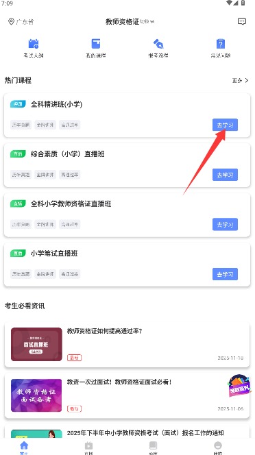 4、进入学习首页后可在热门课程推荐区选择教学内容,点击去学习开始备考。