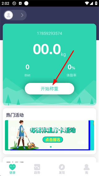 3、进入健康数据主界面可查看体重、BMI及体脂率等指标,通过开始称重功能进行实时测量。