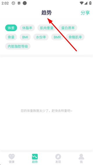 4、切换至趋势分析页面可追踪体重、体脂、肌肉量等多项身体数据的长期变化曲线。