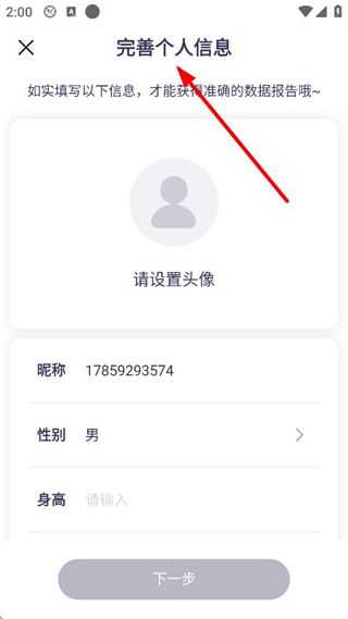 1、在个人信息完善界面设置头像并填写昵称、性别与身高数据,确保资料准确以获得科学分析报告。