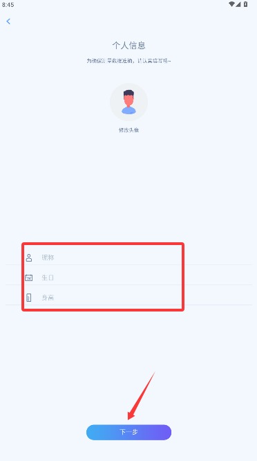 4、上传个人头像并填写昵称、出生日期与身高等资料,确认后即可进入应用主界面。