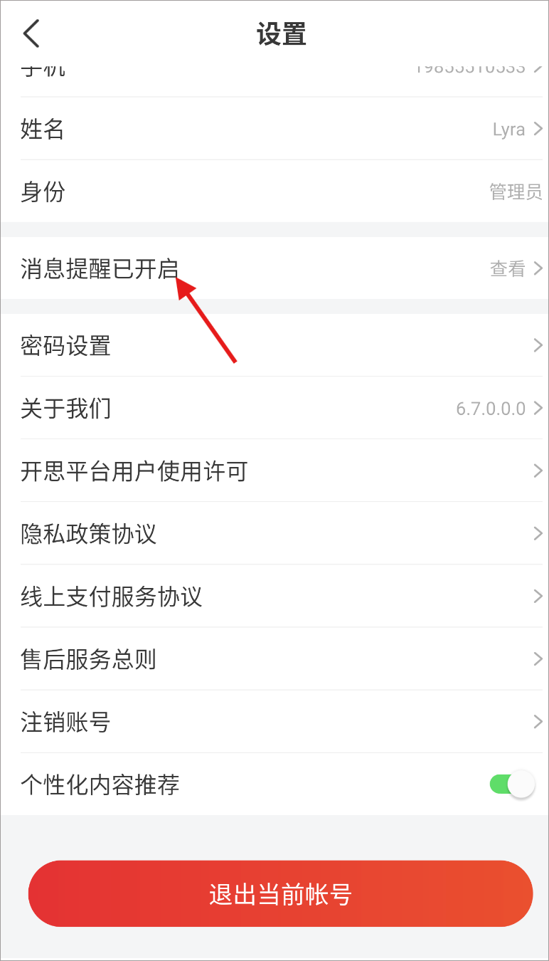 3、进入设置界面点击 “消息提醒已开启” 的功能条目,