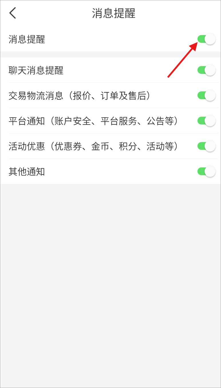 4、在消息提醒设置区域,找到对应的开关按钮,点击将其关闭,即可完成消息提醒关闭操作。