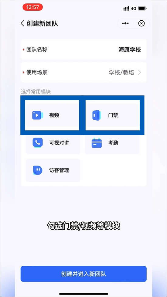 3、选择视频、门禁、访客管理等模块,点击下方创建并进入新团队
