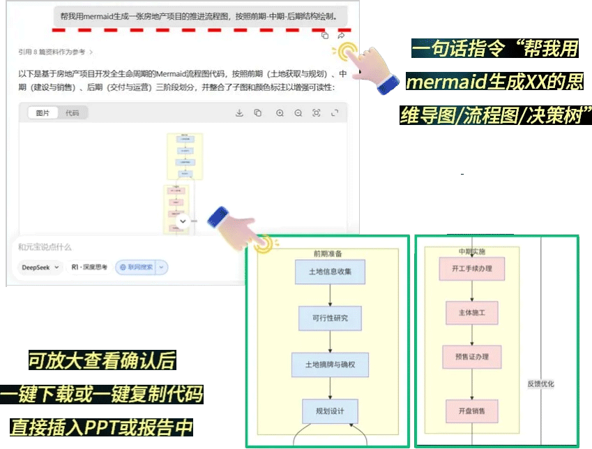 都说文不如表,表不如图,所以学习工作中时不时就得让你出图,自己动手编辑半天经常是剪不断理还乱,现在用腾讯元宝一句话就能搞定,深度思考秒出图表,以往觉得复杂的mermaid图表也不在话下~不需要再苦苦敲代码,同样一句话说明白需求就能直出,太赞了!