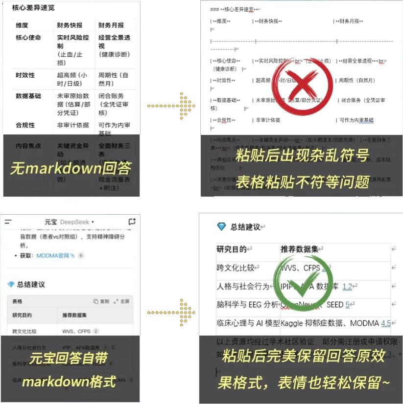 腾讯元宝非常贴心地考虑到我们复制使用回答的情况,输出的回答都自带markdown格式,直接复制粘贴就能很好地保留回答的原格式[棒R],避免出现粘贴后各种符号还得删除、回答中含有的表格粘贴后格式混乱等问题,考虑的很周到~这种细节可见产品的设计用心之处~
