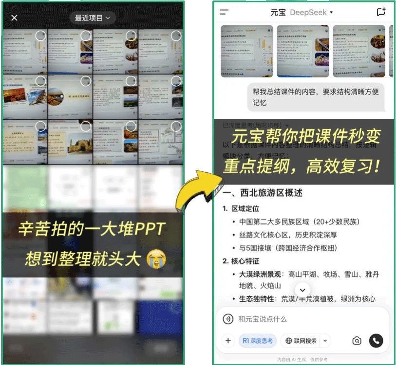 腾讯元宝接入AI双模型,能够轻松处理各种复杂情形,直接发送图片、word或pdf等文稿也能根据指令快速分析,流畅输出回答,比如大学碰上不给PPT的老师,只能一张张拍下来回去梳理费不少功夫,可以直接把照片给元宝帮你总结课件内容,或者工作中的会议文字稿直接给元宝,快速出一份会议纪要~能省出不少宝贵的时间!