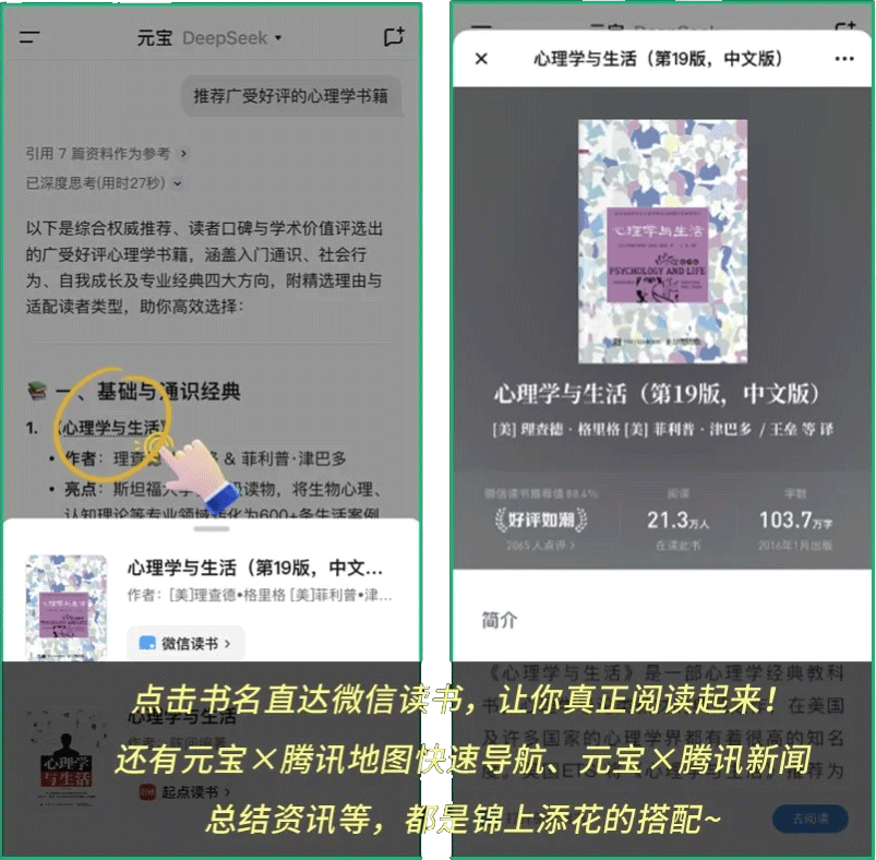 腾讯在各领域都有好用的主流产品,配合上腾讯元宝可以直接跳转互通,搭配使用起来简直不要太方便,比如联动微信读书,让元宝给我们推荐好书时点击书名下划线就能跳转至微信读书,让我们可以马上品一品好书,拒绝收藏吃灰!当然,元宝同样也能联动腾讯地图、腾讯文档、腾讯新闻等,这些应用搭配上元宝绝对都是锦上添花~