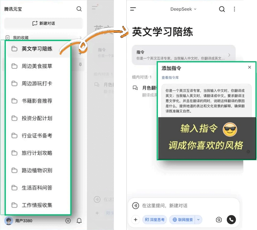 我们用AI工具久了就会发现历史提问比较凌乱,有时想找之前的回答看看都不方便,在腾讯元宝中就能通过新建文件夹,按各种主题将历史对话进行分组,并且对每个分组还可以定下指令,明确语气、风格或是目标等,比如进入英语陪练组让元宝当你的老师,进入工作情报组让元宝收集行业前沿信息…超高效地帮助你工作学习生活中的方方面面。