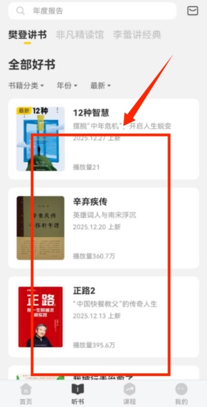 2、在听书页面中仔细浏览,点击选择您喜欢的书籍作品。