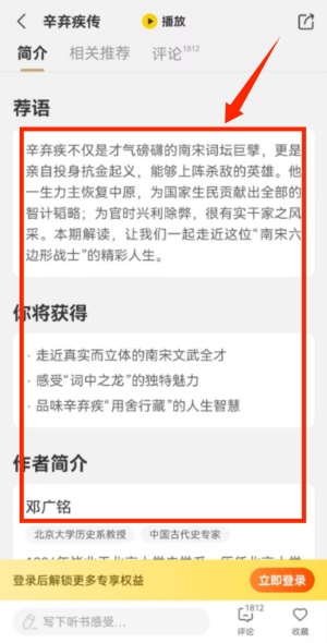 4、在播放页面下滑屏幕,可以查看该书籍的详细内容简介。