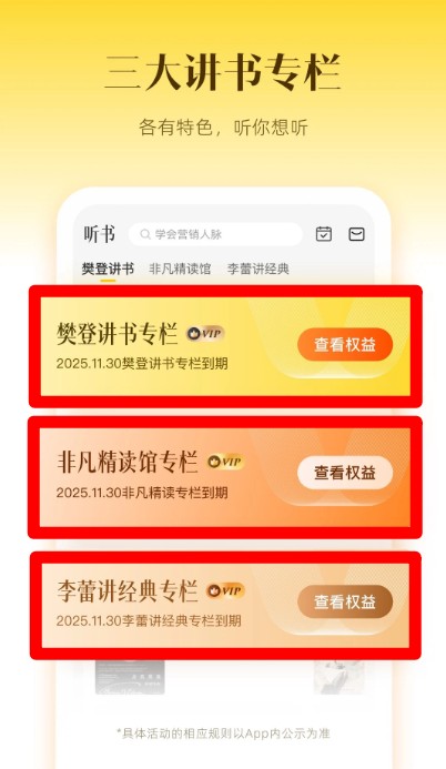 2、帆书设有三大讲书专栏:樊登讲书、非凡精读馆、李蕾讲经典,满足不同兴趣用户的听书需求。