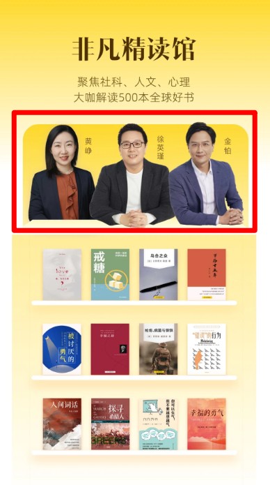 4、非凡精读馆聚集百位专家,聚焦社科、人文、心理领域,讲解全球500本优质好书内容。