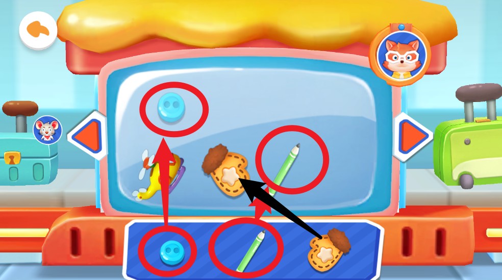 5、进入安检关卡,观察屏幕内的物品并将按钮、铅笔等对应物品拖入下方,考验宝宝观察力。