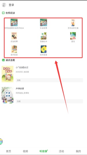 2、成功进入软件首页后,在功能菜单栏中找到并点击 “听故事” 选项入口。
