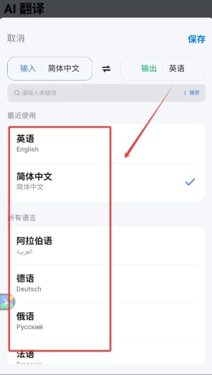 3、在翻译界面点击语言选项,选择需要翻译的源语言与目标语言。