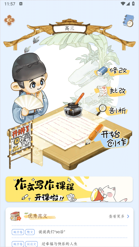 2、在写作页面中可以对用户自行编写的诗词进行修改、批改、剖析,还能查看丰富的优秀范文