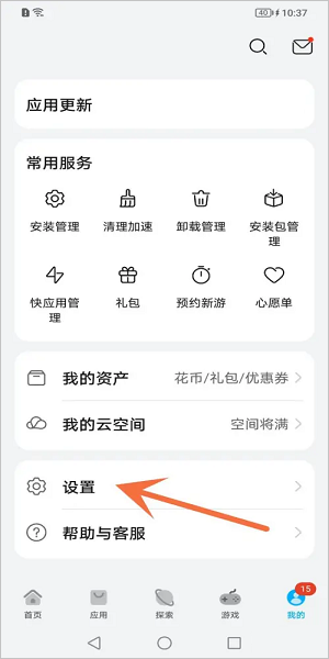 1、打开华为应用商店app后,点击右下角“我的”,并选择“设置”;