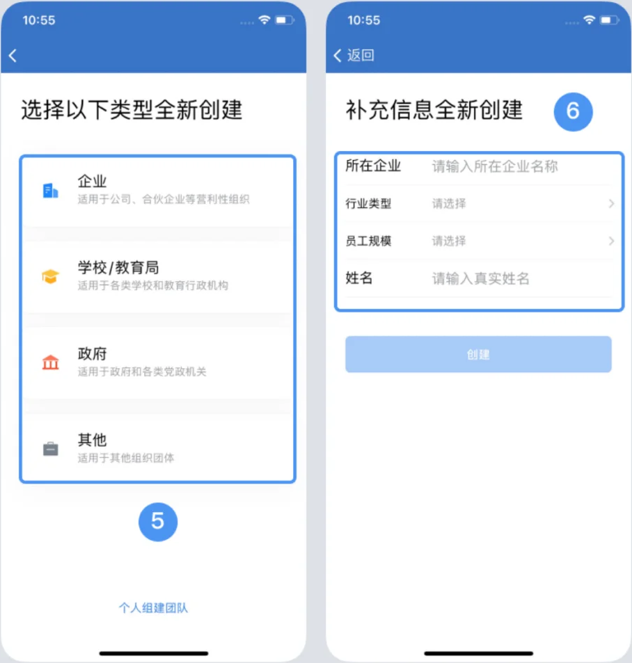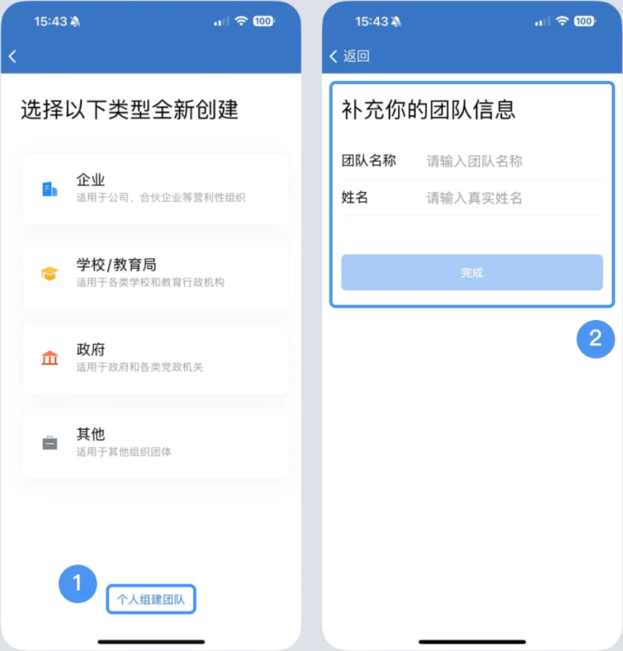 3、如果需要个人组建团队,可以在手机端创建企业页面底部点击“个人组建团队”入口,补充团队名称以及注册人姓名,即可注册成功