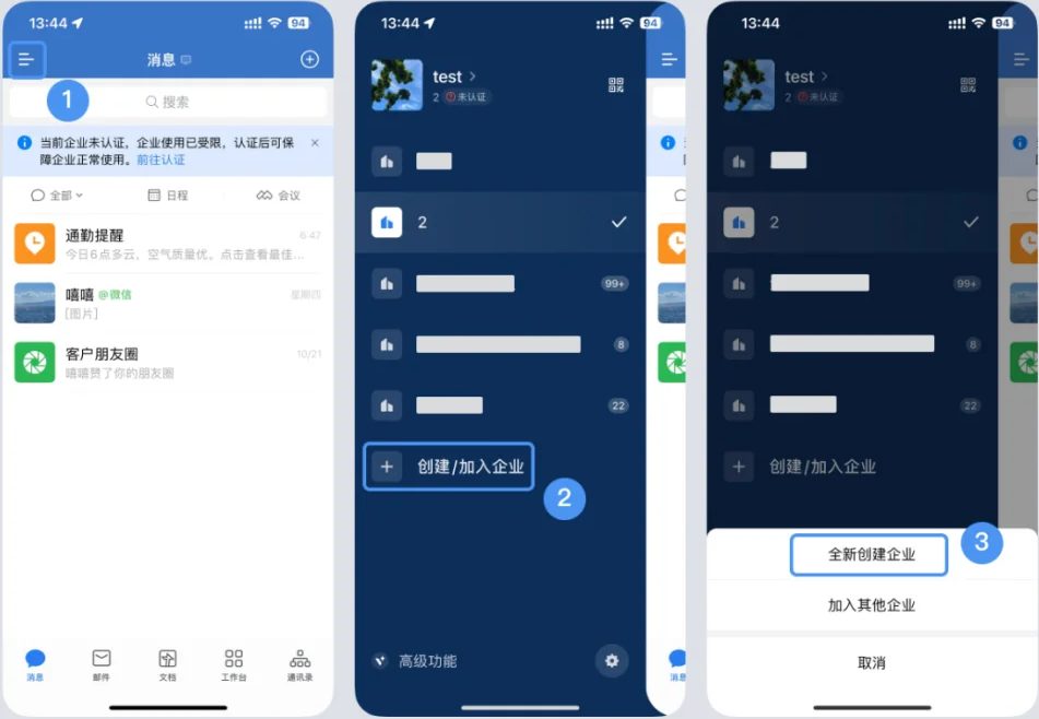 1、在【企业微信app官方正版手机端->消息界面->左上角三横->创建/加入企业->全新创建企业】