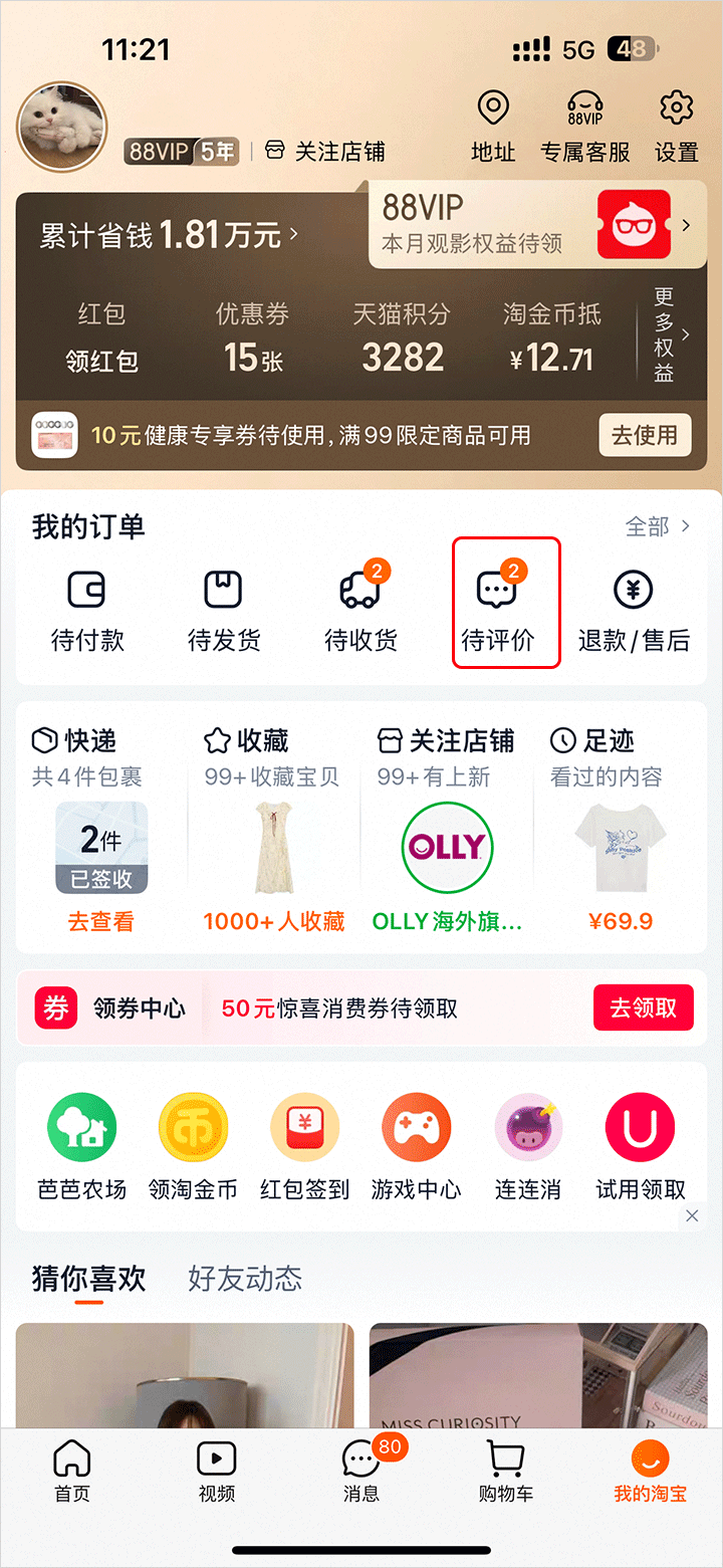 1、首先到“我的淘宝”模块中,在我的订单这一栏目下,点击“评论”进入;