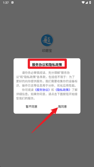 1、首次进入印题宝APP时,会弹出《服务协议和隐私政策》,用户需点击“我同意”按钮后才能继续使用。