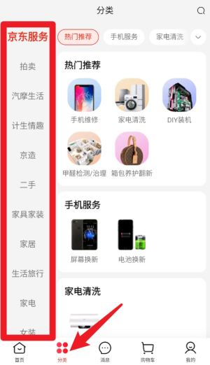 2、点击底部导航栏的“分类”,可浏览京东服务、拍卖、家居等多种精选分类。