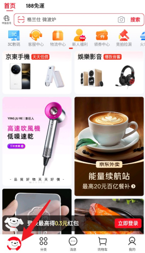 1、点击首页左下角京东狗图标,即可进入主页面,发现最新活动及推荐商品。