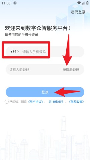 1. 打开 App 后输入手机号码并获取验证码,勾选协议选项后点击底部蓝色按钮完成登录。