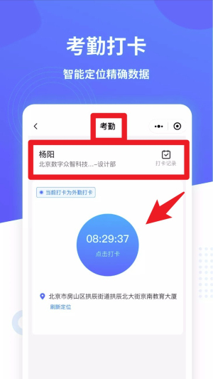 3. 实名后点击“考勤”模块,查看打卡时间和地点,点击按钮完成考勤打卡。