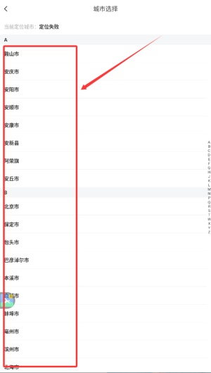 2、在弹出的城市列表中,请准确点击选择您当前所在的具体城市名称。